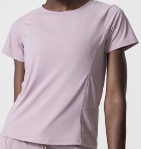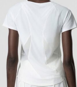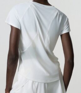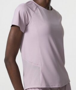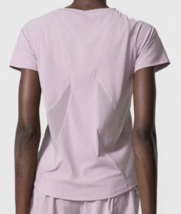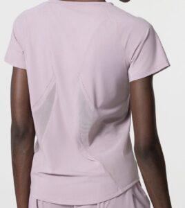 Camiseta Yoga Flex, trasparencias de diseño en espalda sutiles, manga corta. colores malva y blanco. tela secado rápido