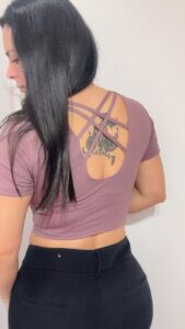 Crop top disponible en color purpura, rosa y negro. con diseño cruzado en espalda, tela elástica y de secado rápido. soporte de busto integrado